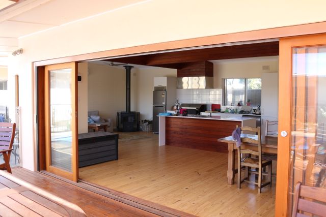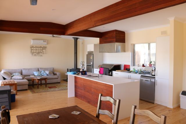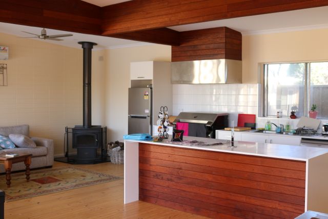 To reflect our client’s love of Australian hardwood timber, we installed Western Red Cedar doors and windows, recycled timber floors, multiple Merbau decks, and a hardwood pergola. Inside, Merbau timber was used to tie the indoor and outdoor design together. It was used for the kitchen range hood, the island bench back panel and for the ceiling’s structural beams. Special features include a fireplace that provides a warm focal point and an impressive frameless glass balustrade rises from the deck. The project was completed just in time for the family to enjoy summer around the pool.